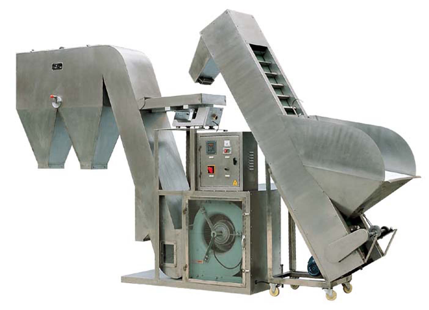 風(fēng)選機(jī)外型圖:風(fēng)機(jī)產(chǎn)生的氣流勻速進(jìn)入傾斜的立式風(fēng)管,物料經(jīng)輸送機(jī)振動器在風(fēng)管